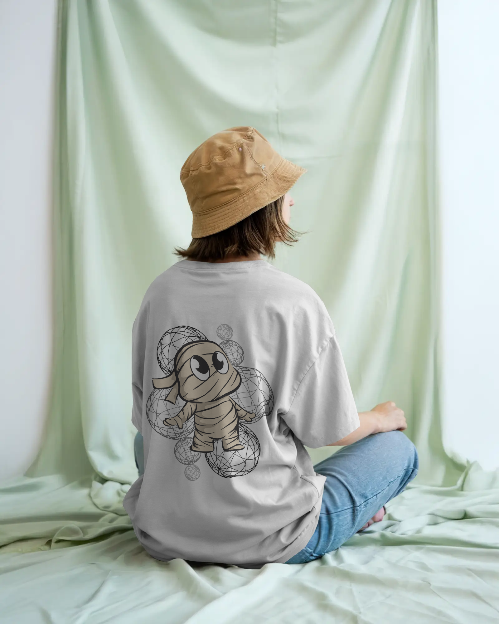 A mummy lost in orbit, stitched on soft lilac cotton. Oversized tee from Cartoon Core.